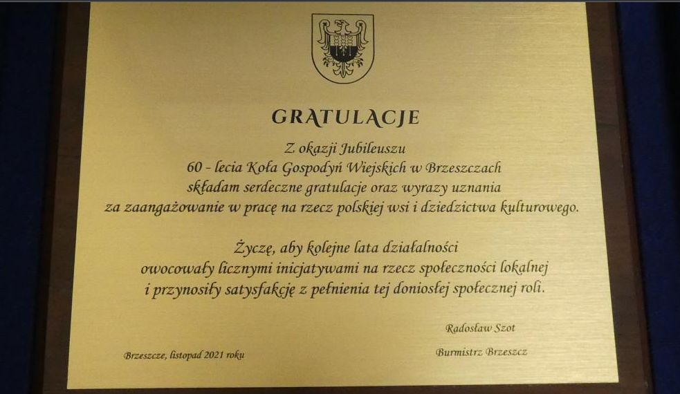 9 listopada z okazji 60-lecia istnienia Koła Gospodyń Wiejskich w Brzeszczach odbyła się uroczystość, będąca podsumowaniem dotychczasowej działalnośc. Była to także okazja do wspomnień i refleksji, a jednocześnie oceny dotychczasowych osiągnięć i wyznaczenia nowych celów oraz zadań. Na ręce przewodniczącej KGW pani Barbary Sajewicz życzenia i gratulacje złożył Burmistrz Radosław Szot.