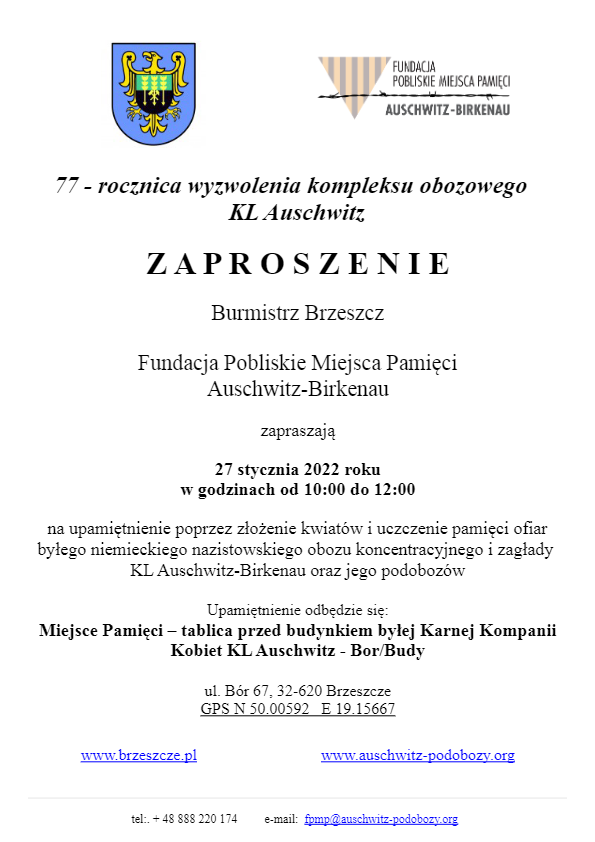 Druga ważna data to 27 stycznia, czyli rocznica wyzwolenia kompleksu obozowego KL Auschwitz-Birkenau i jego podobozów. Upamiętnienie, na które również Państwa zapraszamy wspólnie z Burmistrzem Brzeszcz odbędzie się w podobozie Karnej Kompanii Kobiet KL Auschwitz-Bor/Budy w Brzeszczach.