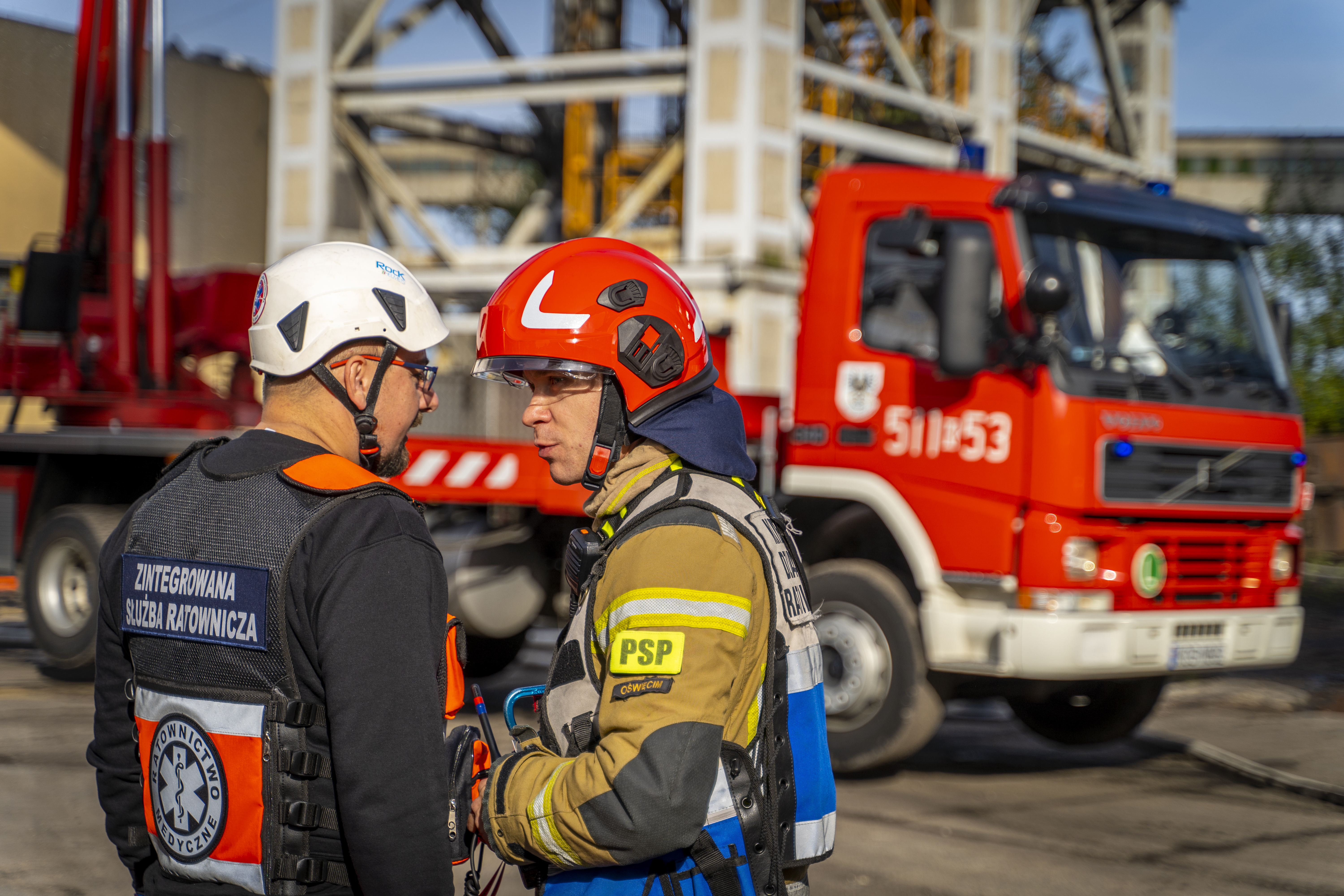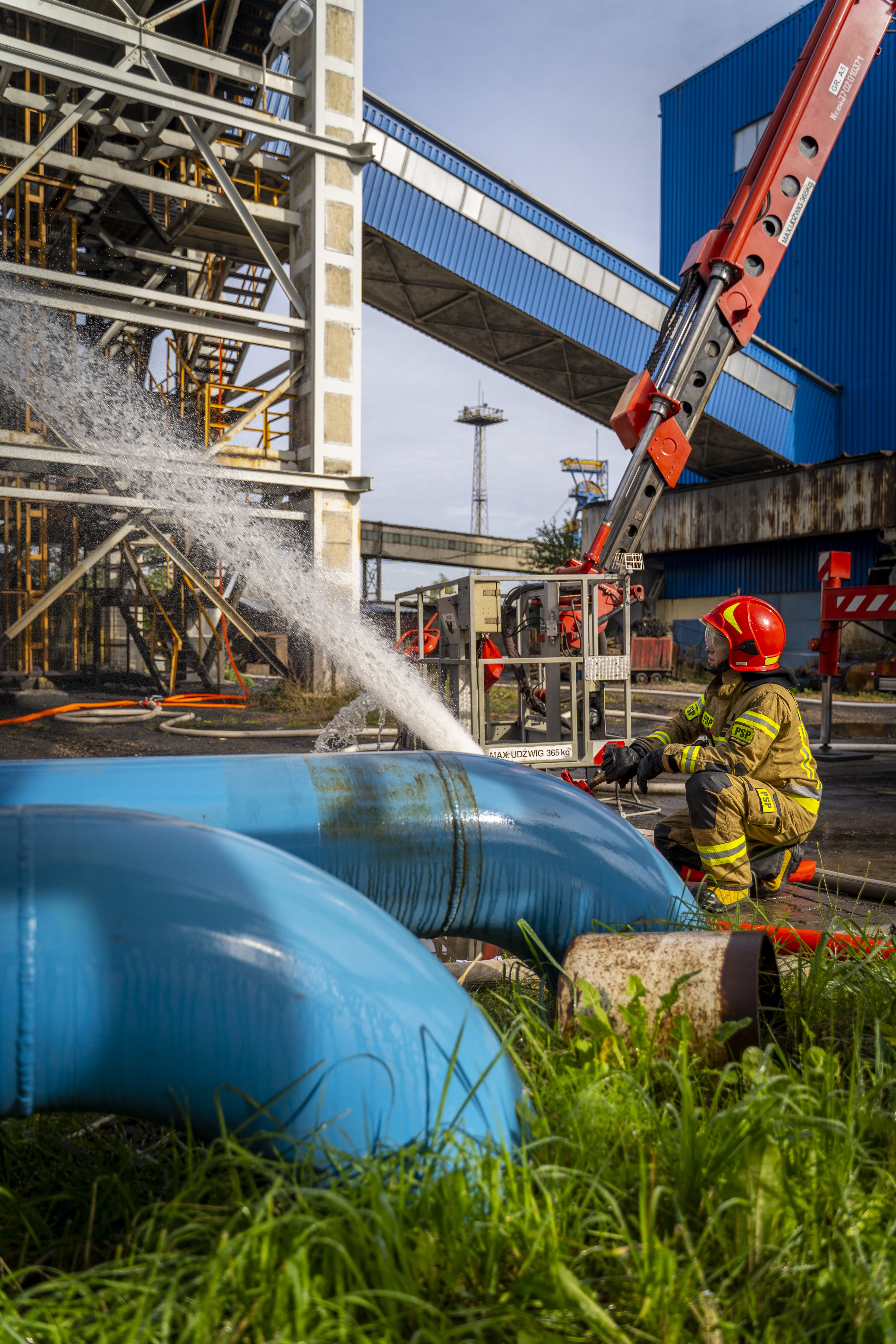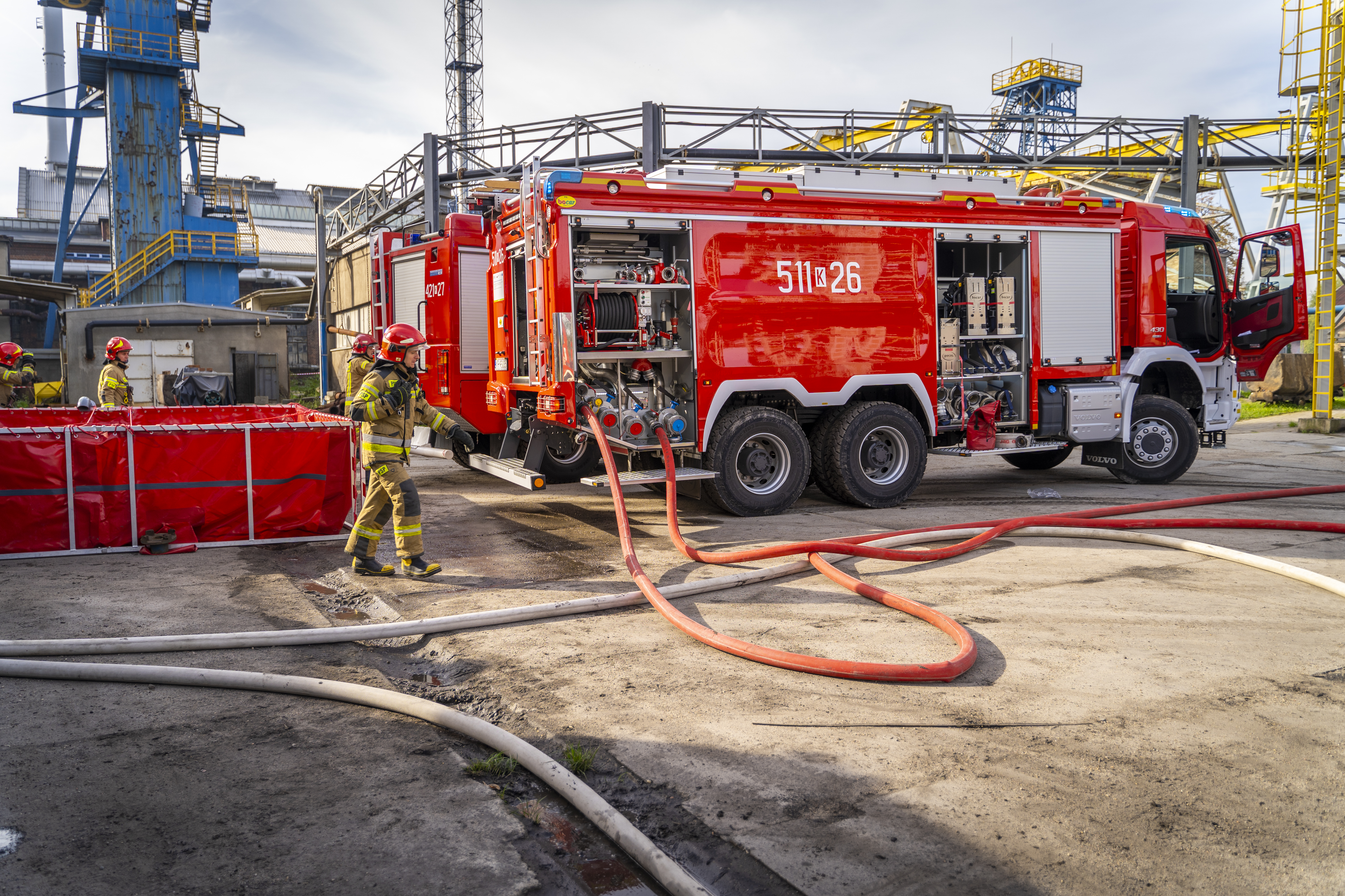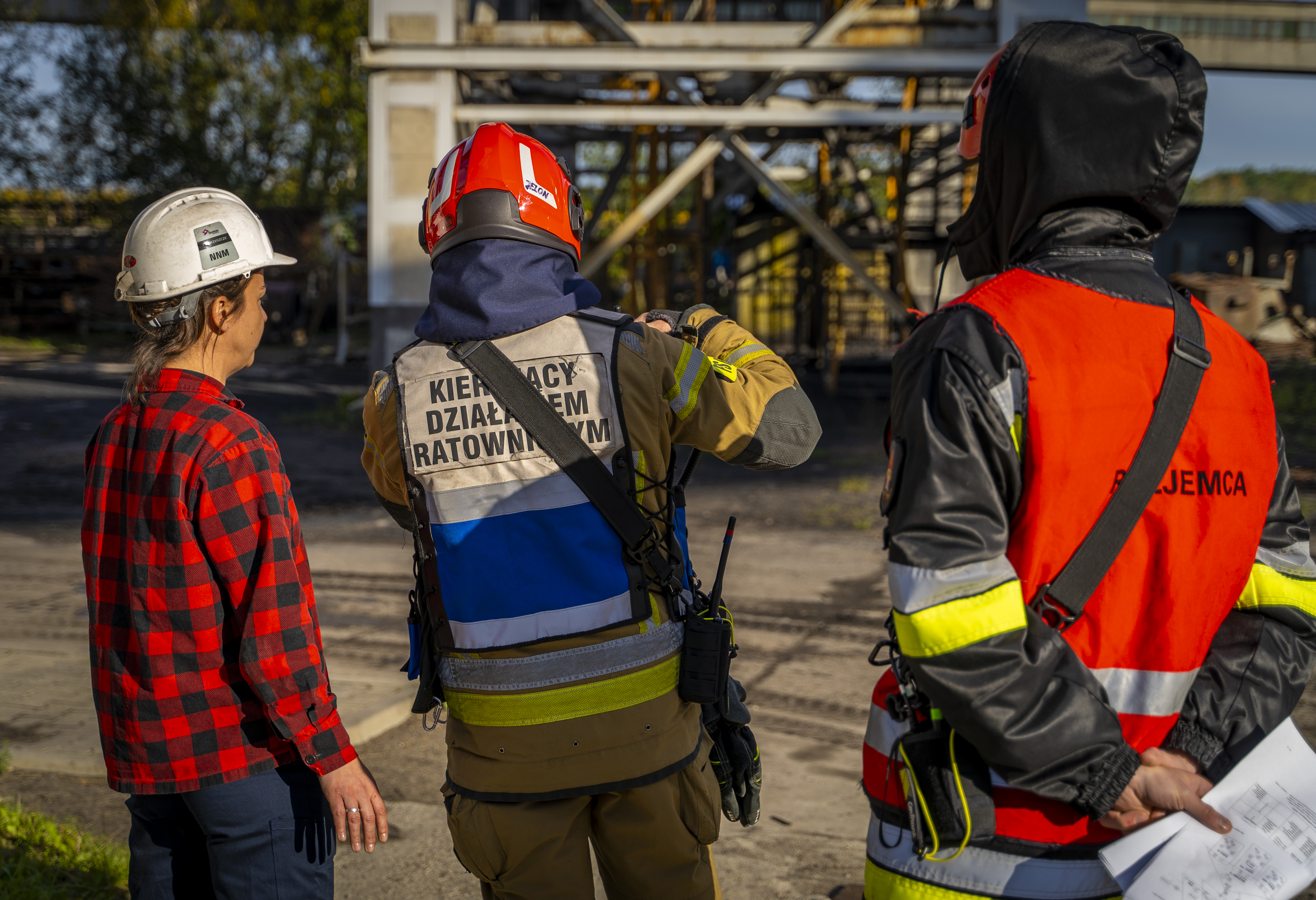 „Ćwiczenia prowadzone na zakładzie obejmowały 3 epizody, które zakładały m.in. pożar na terenie stacji odmetanowania kopalni, pożar przenośnika taśmowego na wysokości” – mówi mł. bryg. inż. Zbigniew Jekiełek z JRG Oświęcim.