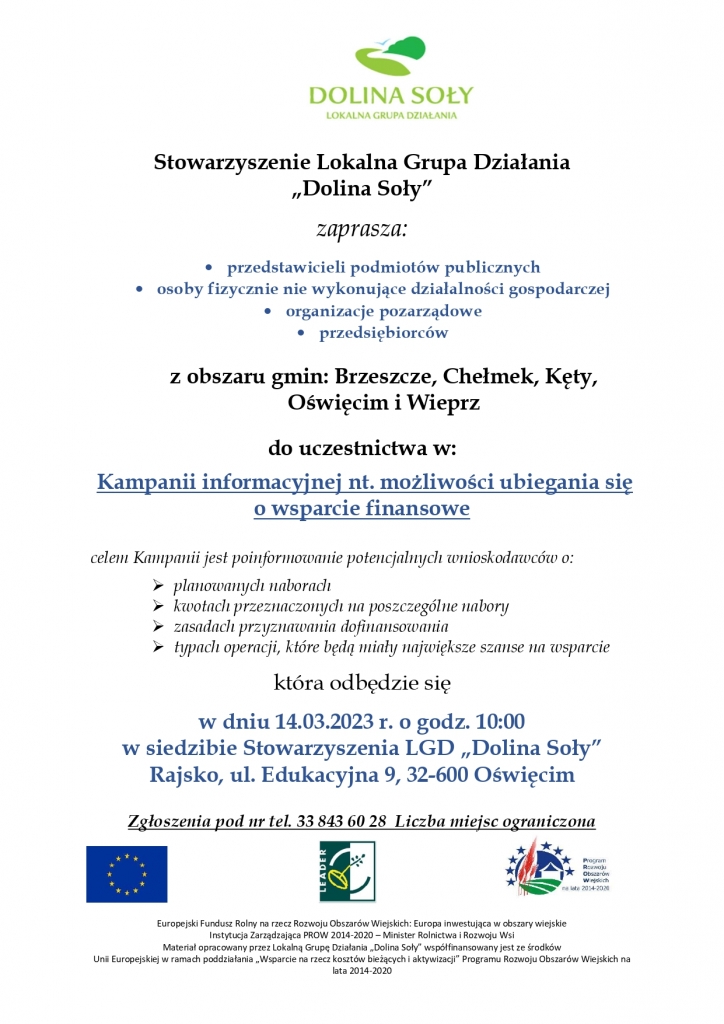 Spotkanie informacyjne dotyczące planowanych naborów wniosków, kwot przeznaczonych do rozdysponowania oraz zasad aplikowania o środki odbędzie się we wtorek 14 marca 2023 roku o godz. 10:00 w biurze LGD “Dolina Soły” w Rajsku (ul. Edukacyjna 9).