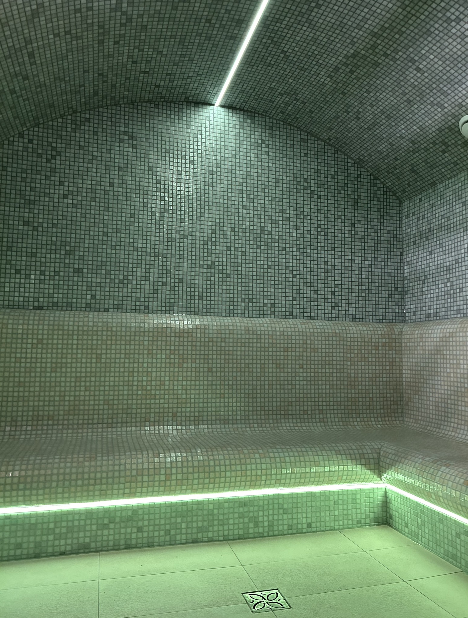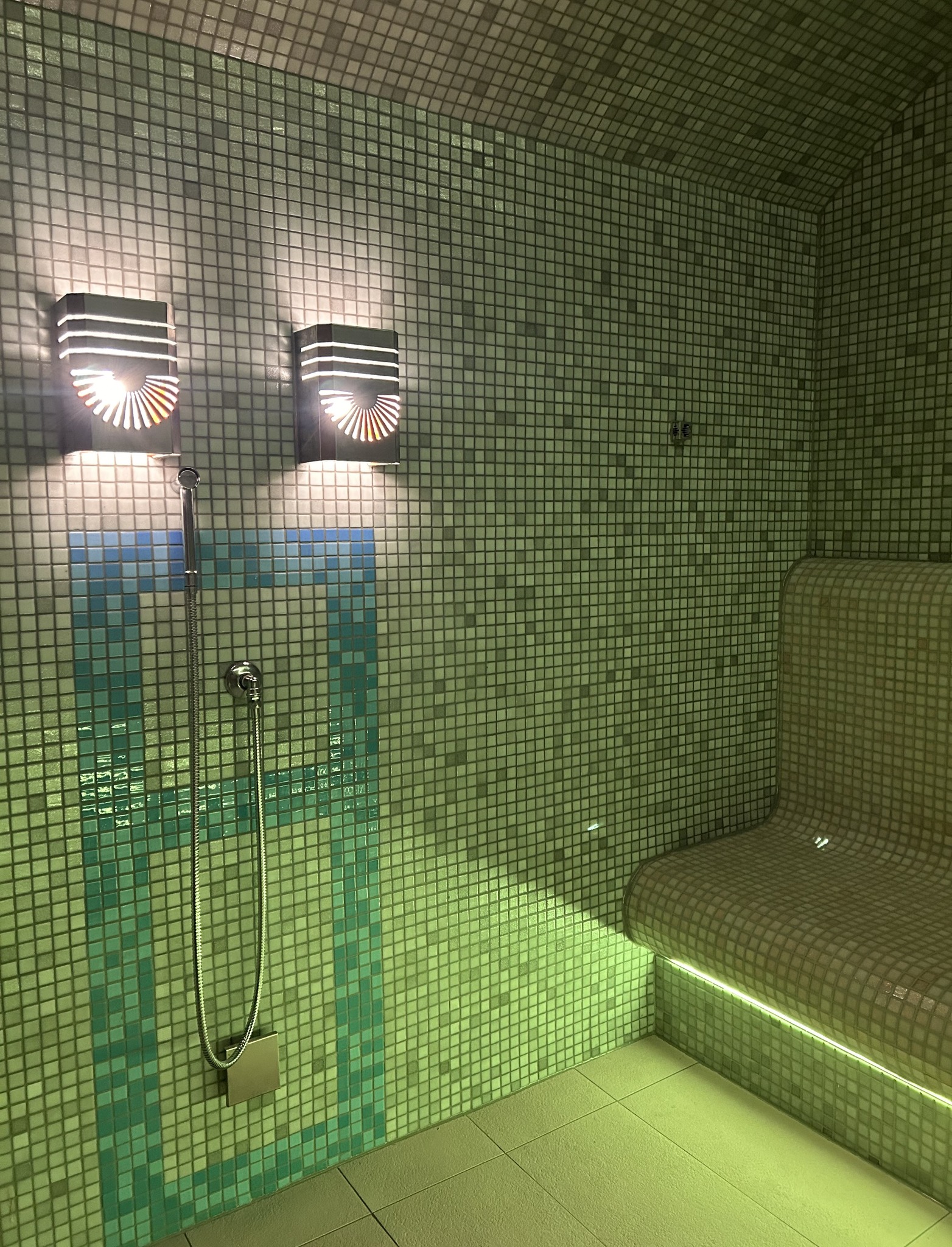 - ściany, sufit i podłogę sauny, które zabezpieczono hydroizolacją, a następnie zaimpregnowano i położono nową glazurę, na ścianach szklaną.