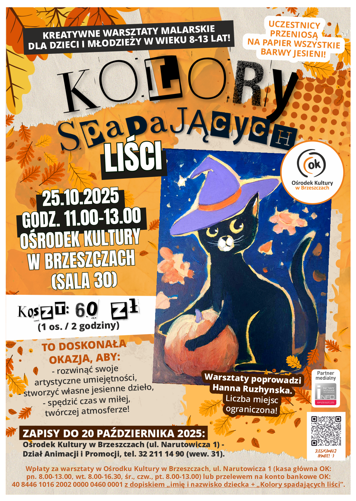 pn. 8.00-13.00, wt. 8.00-16.30, śr., czw., pt. 8.00-13.00) lub przelewem na konto bankowe OK: 40 8446 1016 2002 0000 0460 0001 z dopiskiem „imię i nazwisko dziecka + „Kolory spadających liści”.