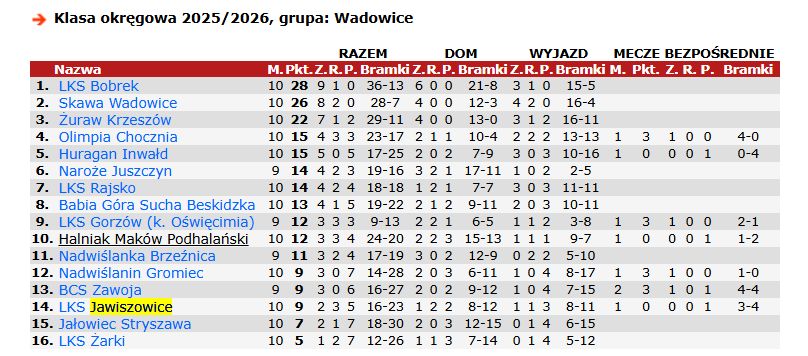 Po dziesięciu ligowych kolejkach skład z Jawiszowic z dziewięcioma punktami zajmuje 14 miejsce.