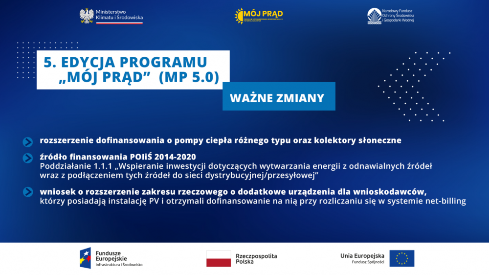 Ministerstwo Klimatu i Środowiska wraz z Narodowym Funduszem Ochrony Środowiska i Gospodarki Wodnej uruchomiły nabór wniosków o dofinansowanie w programie „Mój Prąd”. Piąta edycja programu, obok dofinansowania do wytwarzania energii elektrycznej na potrzeby gospodarstw domowych, została rozszerzona o kolejne elementy tj. kolektory słoneczne oraz pompy ciepła, a bezzwrotna dotacja może wynieść nawet do 58 tysięcy złotych!