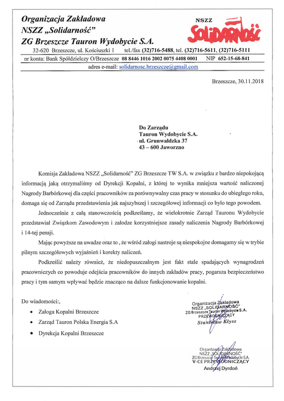 Organizacja Zakładowa NSZZ „Solidarność” ZG Brzeszcze w dniu wczorajszym (30.11.2018r.) skierowała do Zarządu Tauron Wydobycie S.A pismo w którym czytamy: