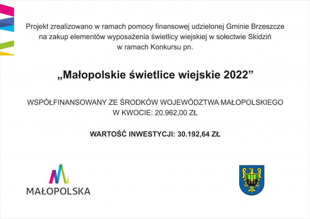 Gmina Brzeszcze pozyskała dofinansowanie ze środków Województwa Małopolskiego w ramach konkursu “Małopolskie świetlice wiejskie 2022”. Dotacja w wysokości ponad 37 tysięcy złotych pozwoliła na zakup wyposażenia do świetlic w Domach Ludowych w Skidziniu oraz Wilczkowicach.