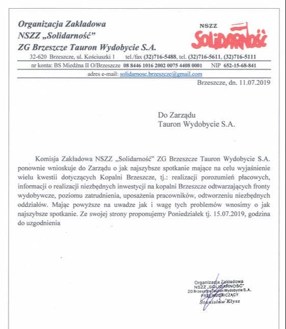 Również 15 lipca z zarządem Tauronu Wydobycie chcą się spotkać pracownicy i przedstawiciele Związków Zawodowych z Zakładu Górniczego w Brzeszczach.