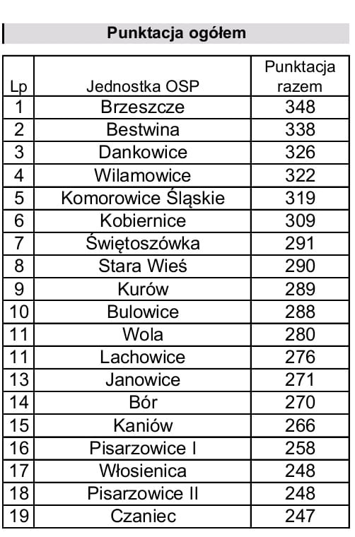 OSP Komorowice Śląskie, OSP Pisarzowice ,OSP Porąbka, OSP Stara Wieś ,OSP Świętoszówka, OSP Wilamowice