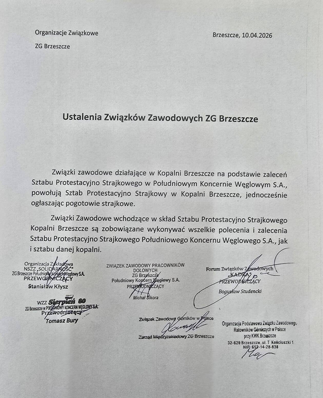 Z treści pisma wynika, że decyzja związkowców ma być odpowiedzią na brak konkretnych rozwiązań dotyczących dalszego funkcjonowania spółki i poszczególnych kopalń, a także na brak realizacji zapisów Umowy Społecznej w zakresie dofinansowania spółek. Pod dokumentem podpisali się przedstawiciele kilku organizacji związkowych działających w Brzeszczach.