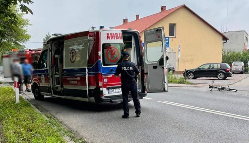 W wyniku potrącenia rowerzysta doznał obrażeń ciała, w stanie przytomnym został przewieziony na leczenie do szpitala.