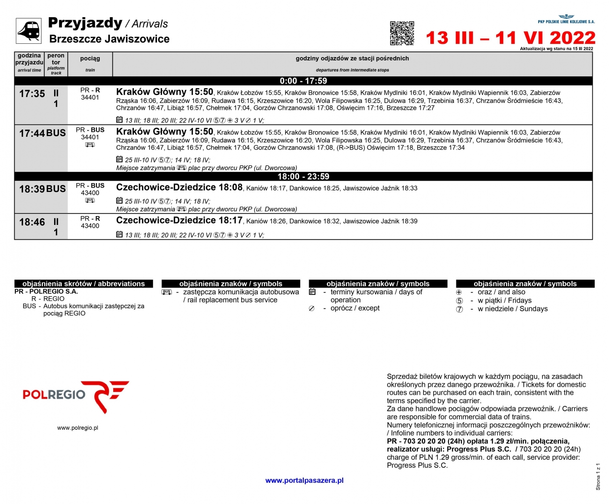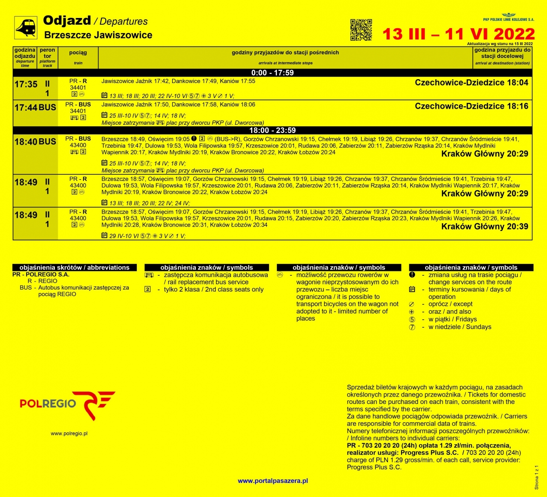 PKP Polskie Linie Kolejowe S.A. – Dział Eksploatacji Zakładu Linii Kolejowych w Krakowie poinformował, że od 13 marca 2022 roku uruchomione zostały połączenia kolejowe ze stacji Brzeszcze – Jawiszowice, przy czym cześć połączeń realizowanych jest komunikacją zastępczą (autobus).