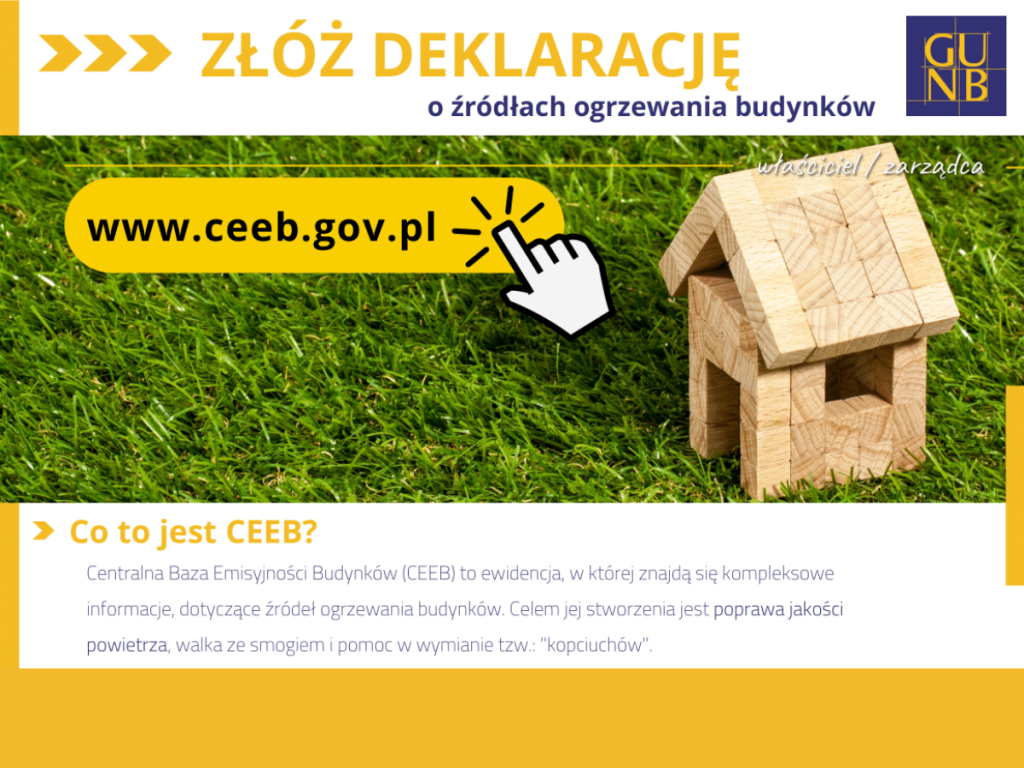 Przypominamy, że zgodnie z uruchomioną 1 lipca 2021 roku Centralną Ewidencją Emisyjności Budynków (CEEB) każdy właściciel ma obowiązek złożenia do 30 czerwca 2022 roku deklaracji o używanych i posiadanych urządzeniach grzewczych – Tutaj