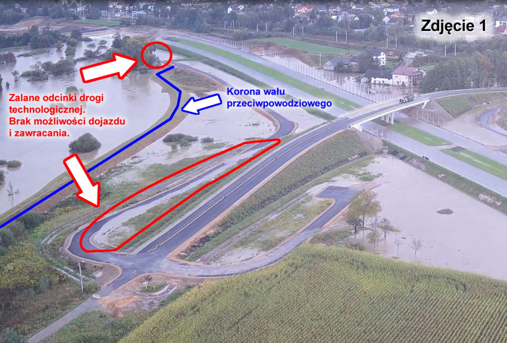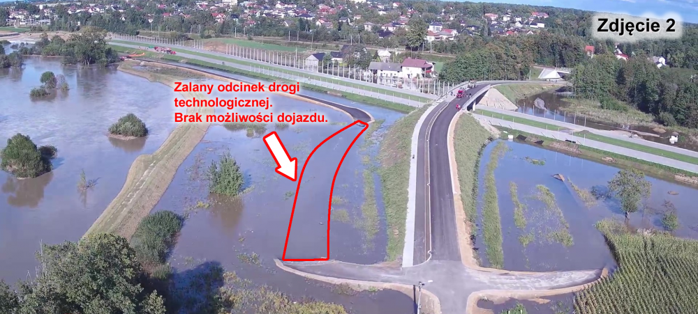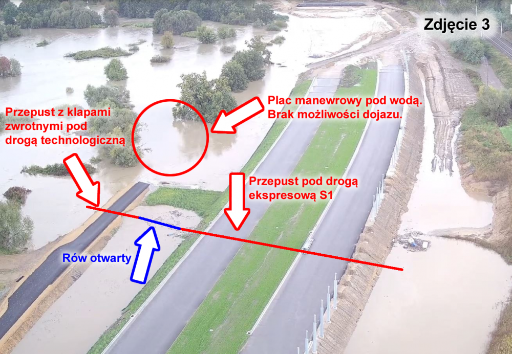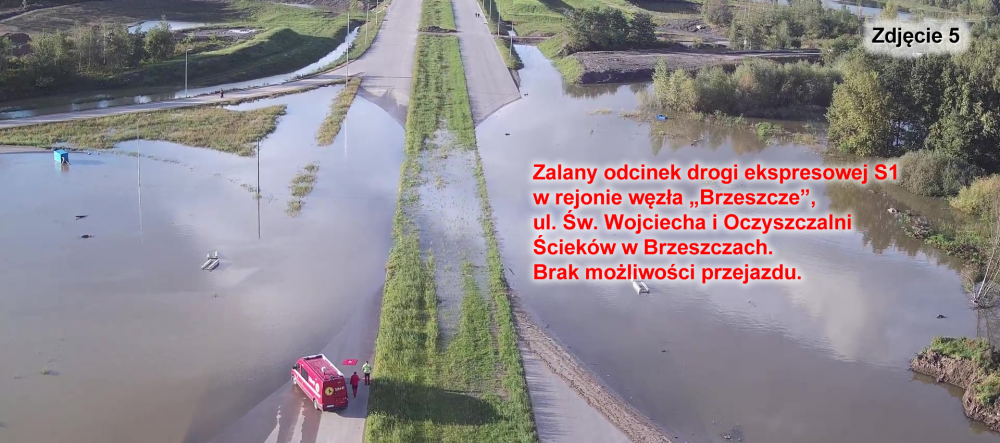 Projektant drogi S1 w okolicach oczyszczalni powinien wziąć na siebie odpowiedzialność. Przecież tamto miejsce, jeszcze przed wybudowaniem S1, było notorycznie zalewane. Stara droga na Pszczynę po niewielkich opadach była nieprzejezdna, dlatego wybudowali wyżej nową drogę (zdj. nr 5 górny prawy róg) Nie wiadomo dlaczego S1 została wybudowana na poziomie starej drogi (poniżej nowej, i dokładnie w tym miejscu jest rozlewisko). Każdy kto mieszka w okolicy dobrze wiedział, że ta droga będzie zalana przy pierwszych, większych opadach. Tak się stało i tak będzie się dziać. Jedynym rozwiązaniem będzie wyniesienie S1 w tym miejscu do poziomu poprzedniej drogi.
