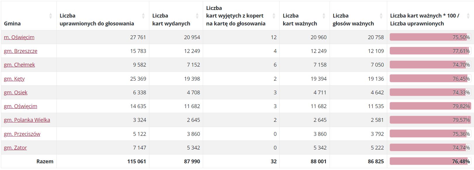 W całym powiecie oświęcimskim, spośród wszystkich uprawnionych, swój obywatelski obowiązek wypełniło 76,48%. W naszej Gminie było jeszcze lepiej, bowiem w lokalach wyborczych podpisy złożyło 77,61% wyborców. A były i takie komisje, gdzie frekwencja zbliżyła się do 83%… Brawo Wy!