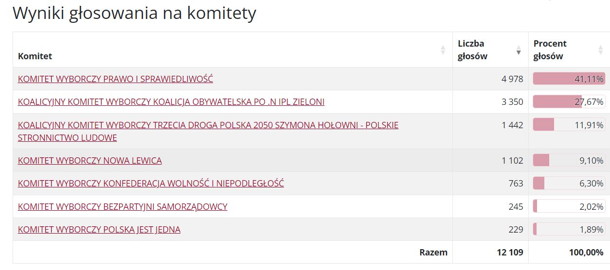 W całej Polsce najlepszy wynik w głosowaniu na posłów osiągnęło PiS – 35,38 proc., uzyskując 194 mandaty. Dalej znalazła się: Koalicja Obywatelska (30,70 proc., 157 mandatów), Trzecia Droga (14,40 proc., 65 mandatów) oraz Nowa Lewica (8,61 proc., 26 mandatów). W Sejmie – z 18 posłami – znajdzie się także Konfederacja, na którą zagłosowało 7,16 proc. wyborców.