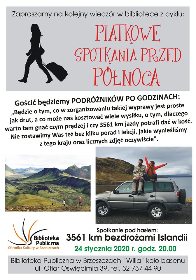 W Bibliotece w Willi w ramach cyklu „Piątkowe spotkania przed północą”, odbędziemy podróż „3561 kilometrów bezdrożami Islandii”. To dzięki PODRÓŻNIKOM PO GODZINACH: „będzie o tym, co w zorganizowaniu takiej wyprawy jest proste jak drut, a co może nas kosztować wiele wysiłku, o tym, dlaczego warto tam gnać czym prędzej i czy 3561 km jazdy potrafi dać w kość. Nie zostawimy Was też bez kilku porad i lekcji, jakie wynieśliśmy z tego kraju oraz licznych zdjęć oczywiście”.