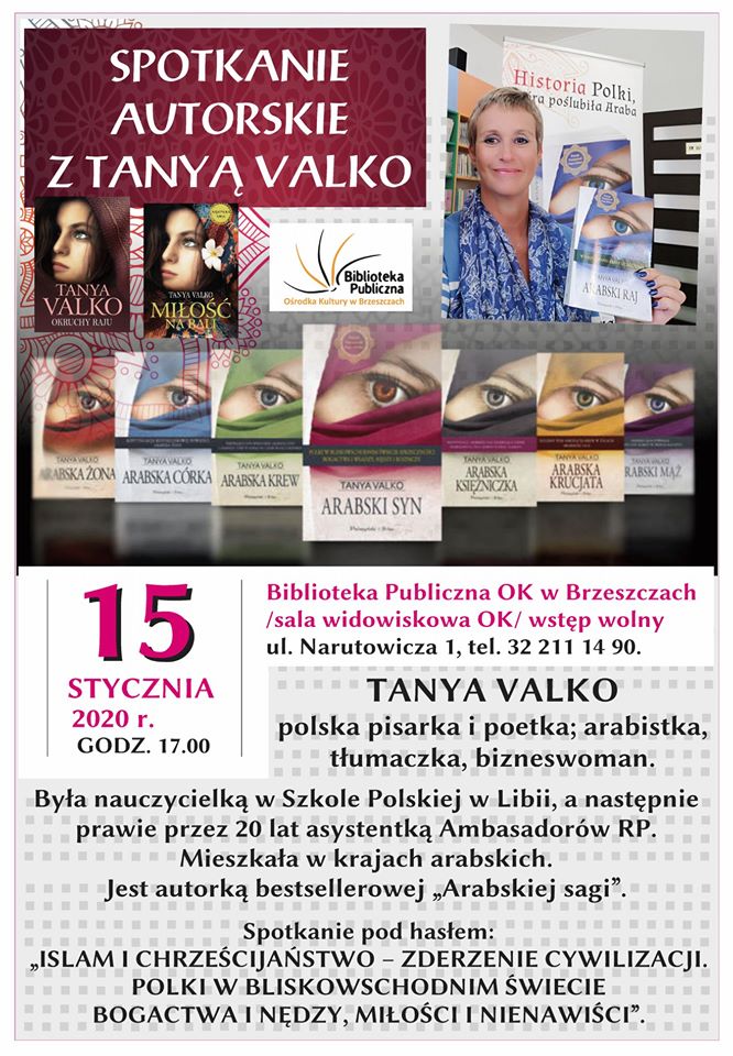 W styczniu zapraszamy do Bibliotek Publicznych OK na spotkania z wyjątkowymi gośćmi! Już 15 stycznia będzie możliwość poznania autorki bestsellerowej „Arabskiej sagi” – Tanyi Valko. Tytuł spotkania: „Islam i chrześcijaństwo – zderzenie cywilizacji. Polki w bliskowschodnim świecie bogactwa i nędzy, miłości i nienawiści”.