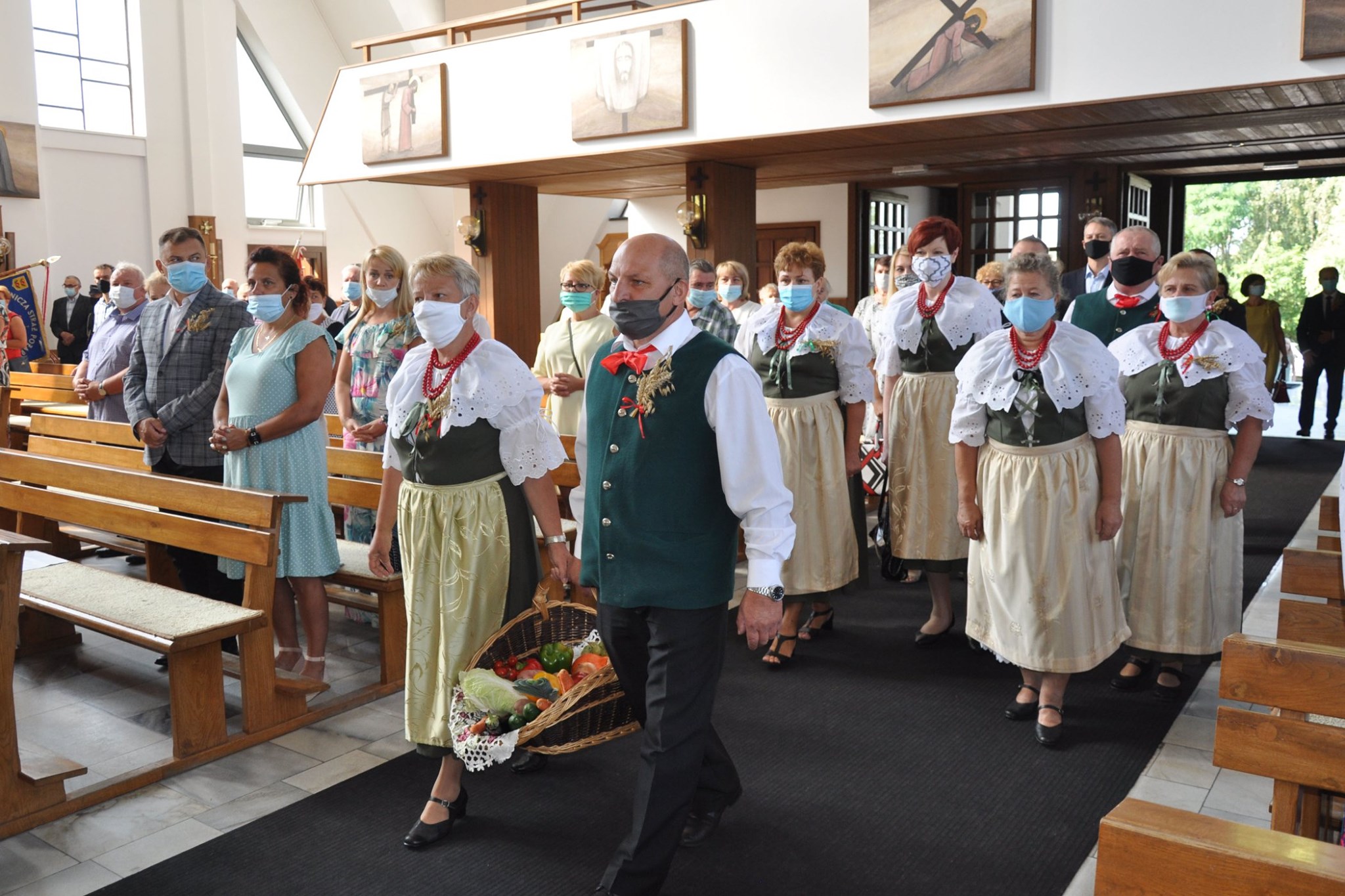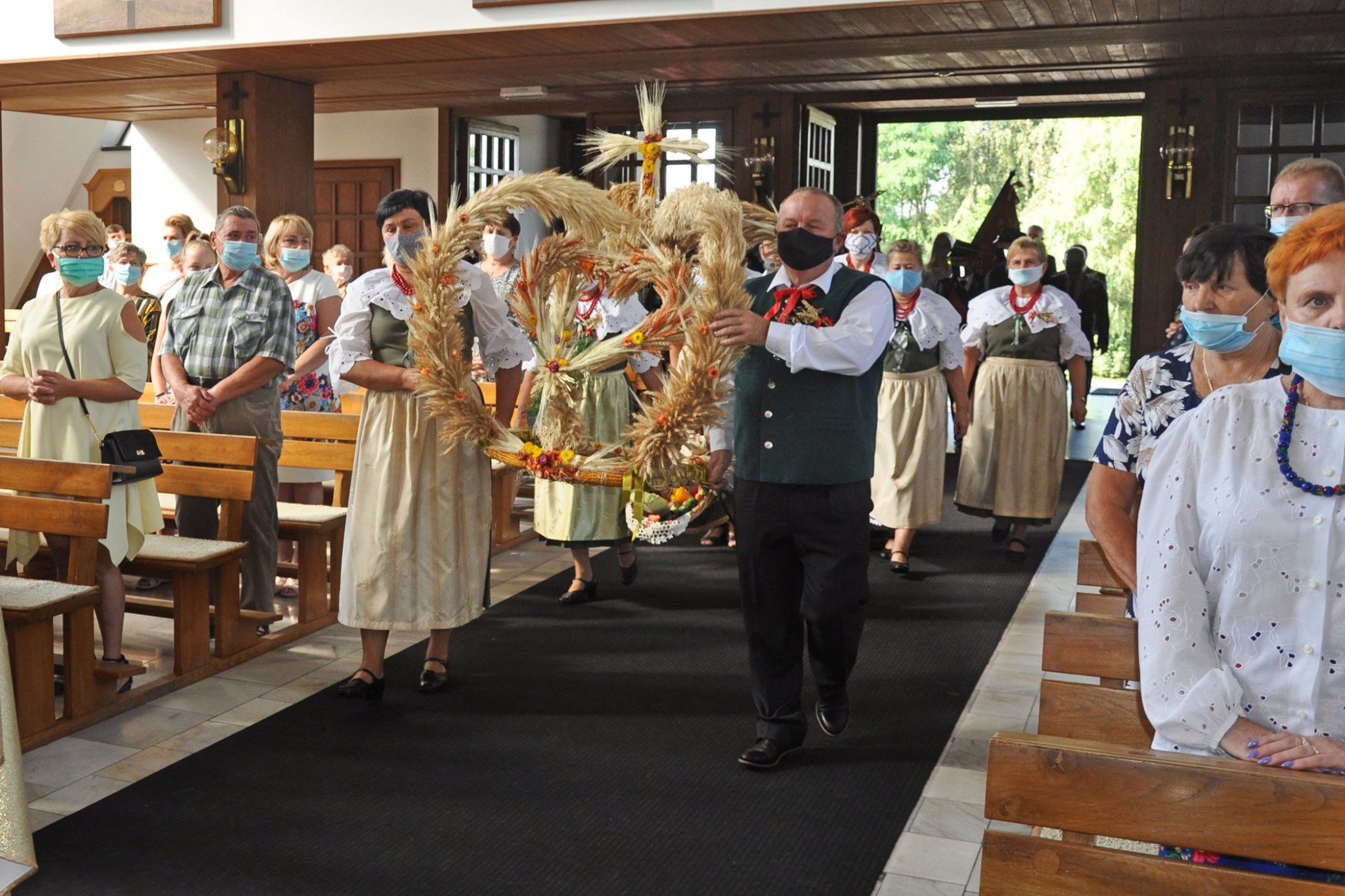 W tym roku kosze z płodami rolnymi oraz wieńce dożynkowe przygotowali i do kościoła wnieśli przedstawiciele kół gospodyń oraz zespołów śpiewaczych działających w Skidziniu, Wilczkowicach i Rajsku.