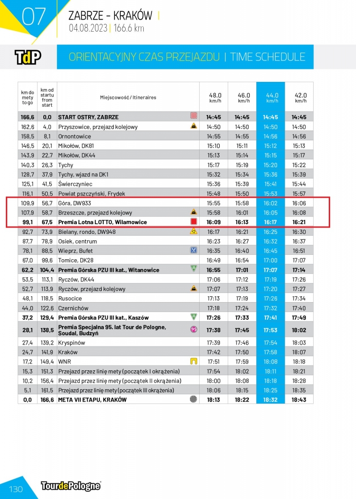 Zgodnie z informacjami zamieszczonymi na stronie www.tourdepologne.pl -KLIKNIJ peleton przejedzie przez Gminę Brzeszcze ok. godz. 16:00- 16:10, kierując się z Miedźnej do Wilamowic.