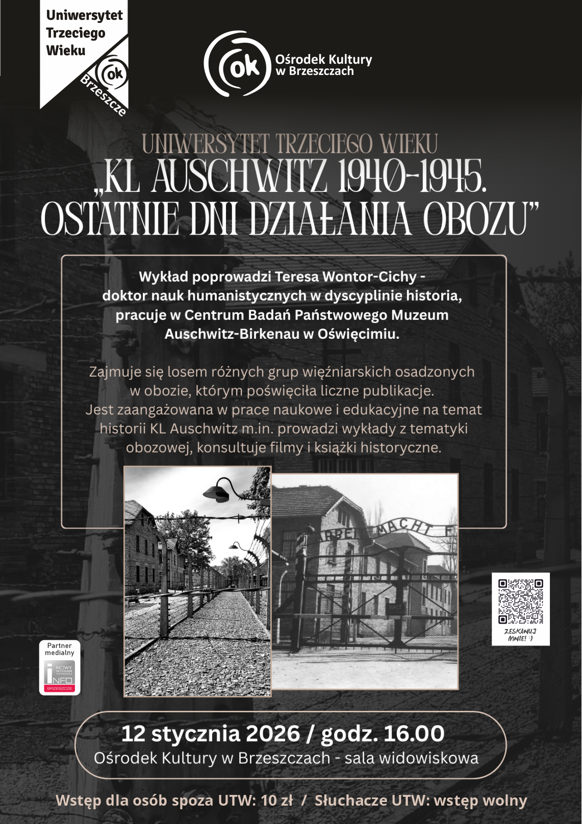 UNIWERSYTET TRZECIEGO WIEKU – „KL Auschwitz 1940-1945. Ostatnie dni działania obozu” – wykład poprowadzi Teresa Wontor-Cichy – doktor nauk humanistycznych w dyscyplinie historia, pracuje w Centrum Badań Państwowego Muzeum Auschwitz-Birkenau w Oświęcimiu. Zajmuje się losem różnych grup więźniarskich osadzonych w obozie, którym poświęciła liczne publikacje. Jest zaangażowana w prace naukowe i edukacyjne na temat historii KL Auschwitz m.in. prowadzi wykłady z tematyki obozowej, konsultuje filmy i książki historyczne.