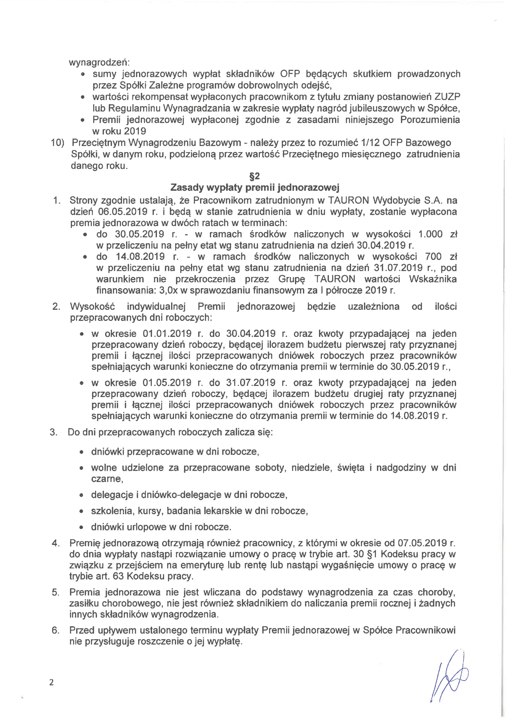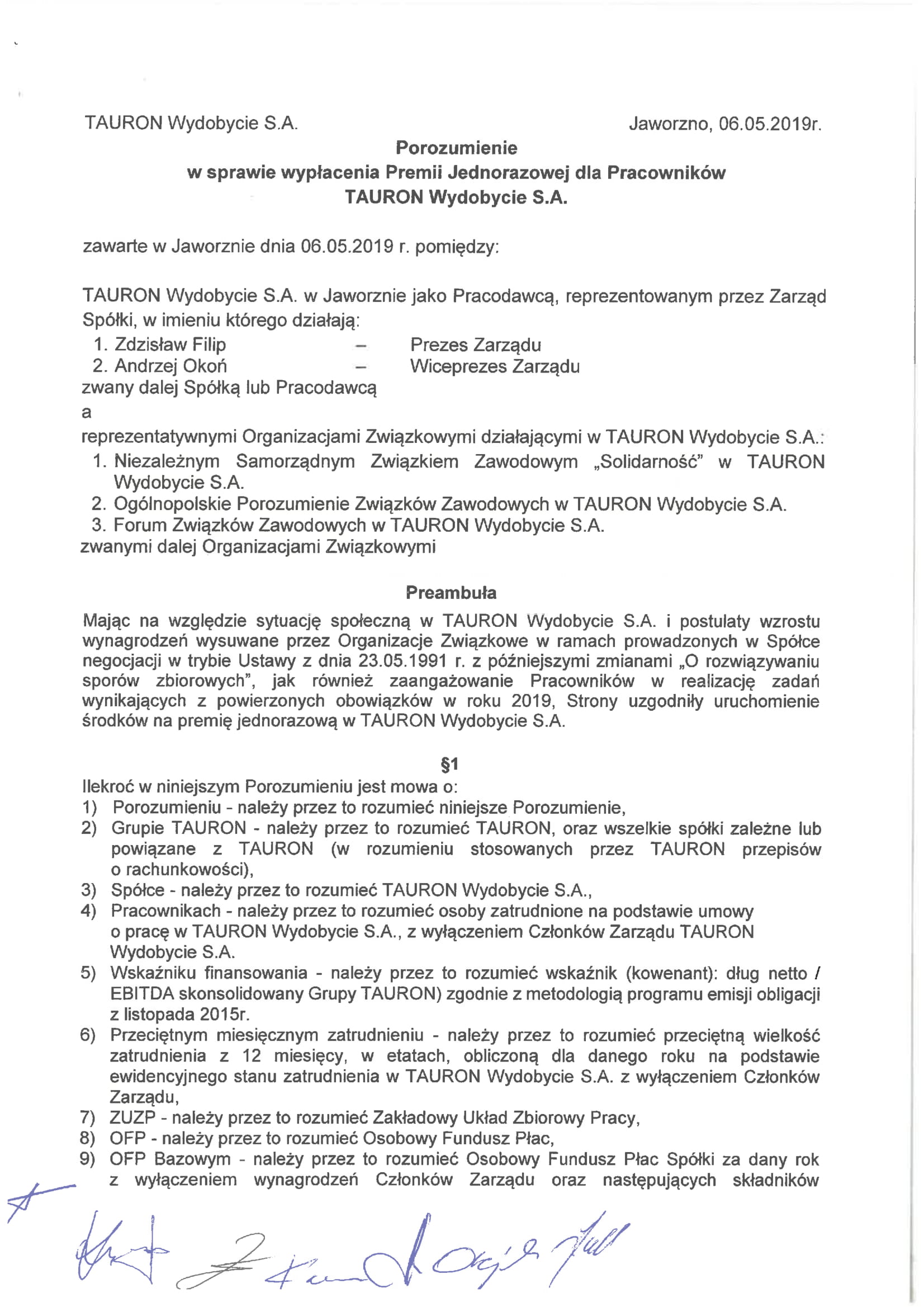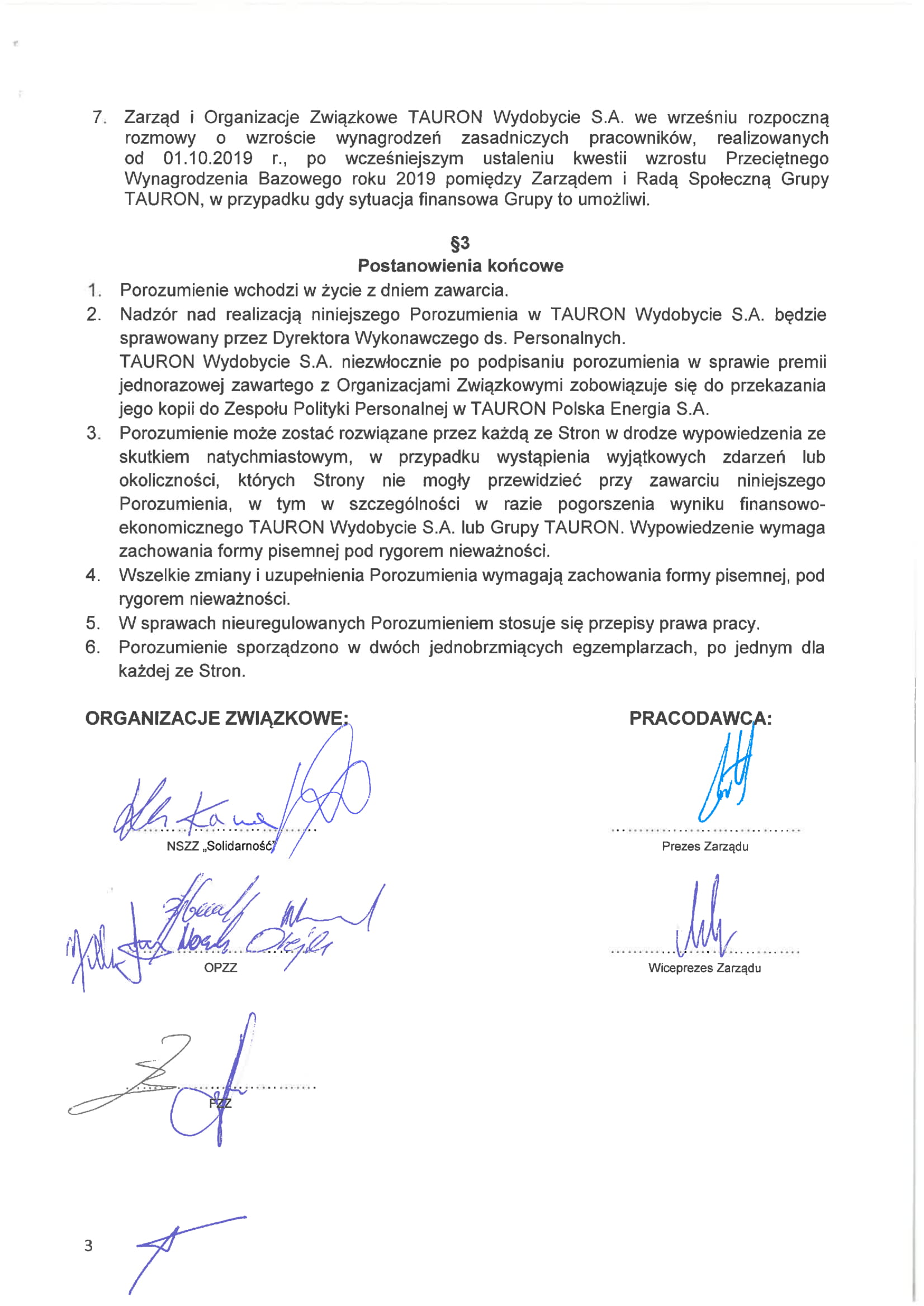 Porozumienie było następstwem rozmów w sprawie podwyżek płac, których domagali się pracownicy TW. Niestety porozumienie nie zostało wypowiedziane przez żadną ze stron i nadal obowiązuje, a co za tym idzie, aktualne są ustalenia związkowców i przedstawicieli Tauron Wydobycie, że „Zarząd i Organizacje Związkowe Tauron Wydobycie S.A we wrześniu rozpoczną rozmowy o wzroście wynagrodzeń zasadniczych pracowników, realizowanych od 01.10.2019r.  po wcześniejszym ustaleniu kwestii wzrostu Przeciętnego Wynagrodzenia Bazowego roku 2019 pomiędzy Zarządem i Radą Społeczną Grupy Tauron, w przypadku, gdy sytuacja finansowa Grupy to umożliwi (Porozumienie z dnia 06.05.2019r. – paragraf 2 punkt 7)”.