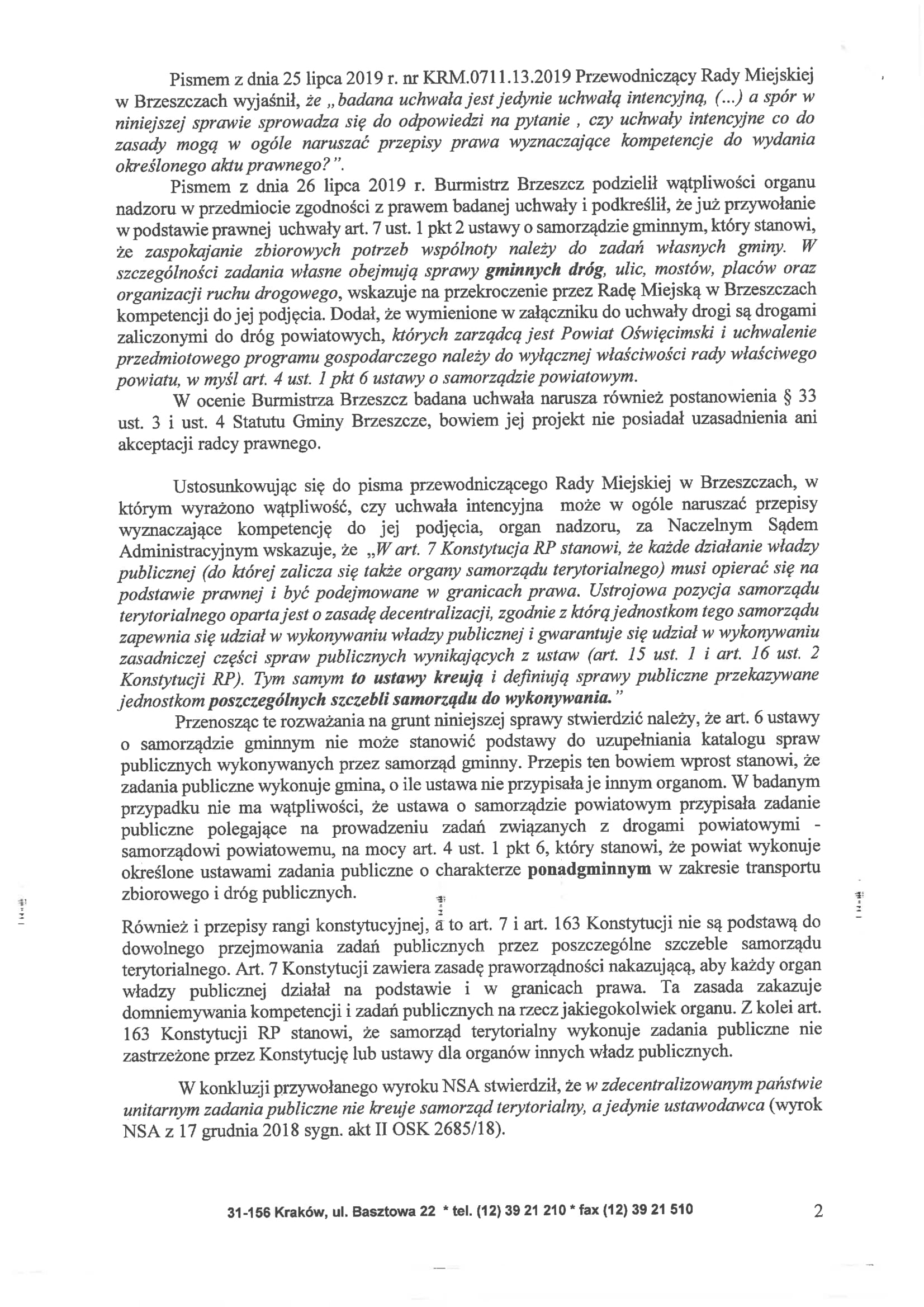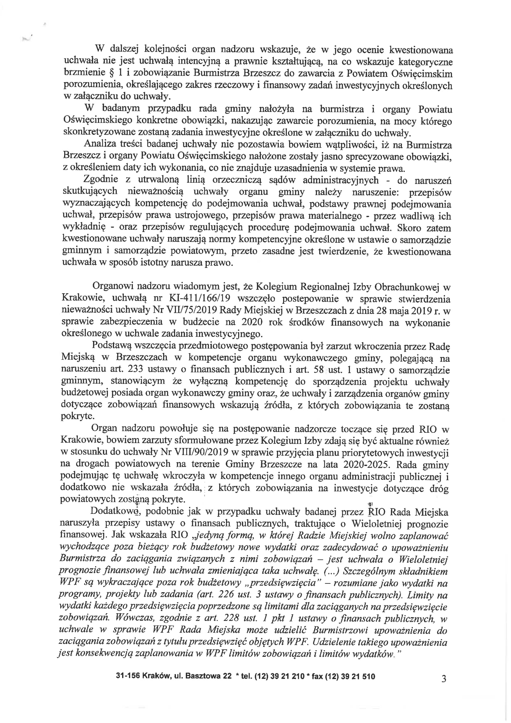 1 sierpnia, Wojewoda Małopolski jako organ nadzoru, unieważnił uchwałę w całości wskazując na niezgodność uchwały Rady Miejskiej w Brzeszczach Nr VIII/90/2019 z dnia 26 czerwca 2019r. z obowiązującym prawem.