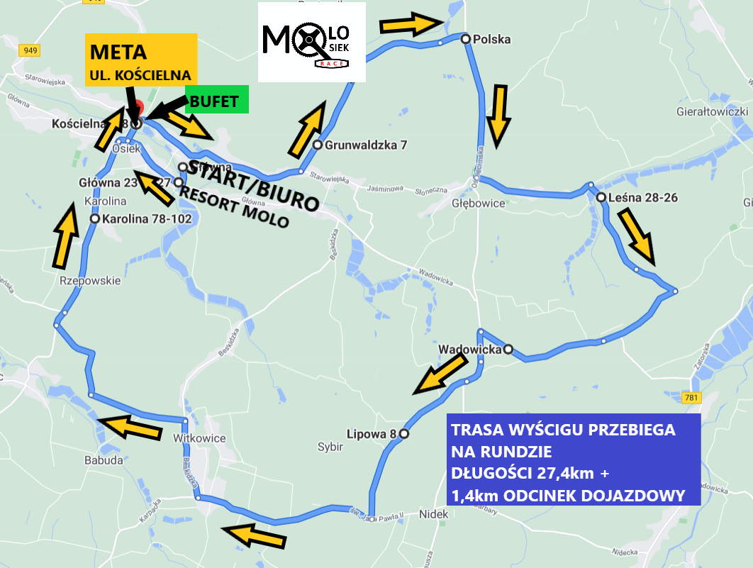 Start Honorowy: Resort Molo w Osieku, dalej wyścig jedzie w prawo w ul. Główną, a po skręcie w prawo w ul. Kościelną zawodnicy wjeżdżają na Rundę, jadą prosto po kostce do góry, gdzie ok. 30 metrów przed skrzyżowaniem z ul. Starowiejską zlokalizowana będzie Meta wyścigu, na skrzyżowaniu zawodnicy skręcają w prawo w ul. Starowiejską i jadą nią prosto, aż do skrętu w lewo w ul. Grunwaldzką. Jadąc tą ulicą dojeżdżają do Granicy Głębowskiej ul. Świerkowa, gdzie po skręcie w prawo w ul. Oświęcimską wyjeżdżają na drogę powiatową i dojeżdżają do Głębowic, gdzie skręcają w lewo w ul. Zamkową , a następnie w ul. Leśną w kierunku Gierałtowic ul.Słoneczna , z której skręcaj ą w prawo w ul. Brzosy na drogę powiatową, jadąc dalej prosto dojeżdżają do ul. Wadowickiej na ternie powiatu oświęcimskiego, a następnie skręcają w lewo w ul. Andrychowską w kierunku miejscowości Nidek , gdzie zjeżdżają z drogi powiatowej w ul. Lipową , z której po skręcie w prawo w ul. Św. Jana Pawła II ponownie wyjeżdżają na drogę powiatową i po dojechaniu do Witkowic skręcają w ul. Beskidzką w kierunku Malca . Po dojechaniu do zakładu Aksam skręcają w prawo w kierunku Osieku i jadąc prosto ul. Karolina dojeżdżają do ronda w centrum Osiek a , a następnie przy Urzędzie Gminy skręca w prawo w ul. Główną, a następnie w lewo w ul. Kościelną na ostatnią prostą do Mety.